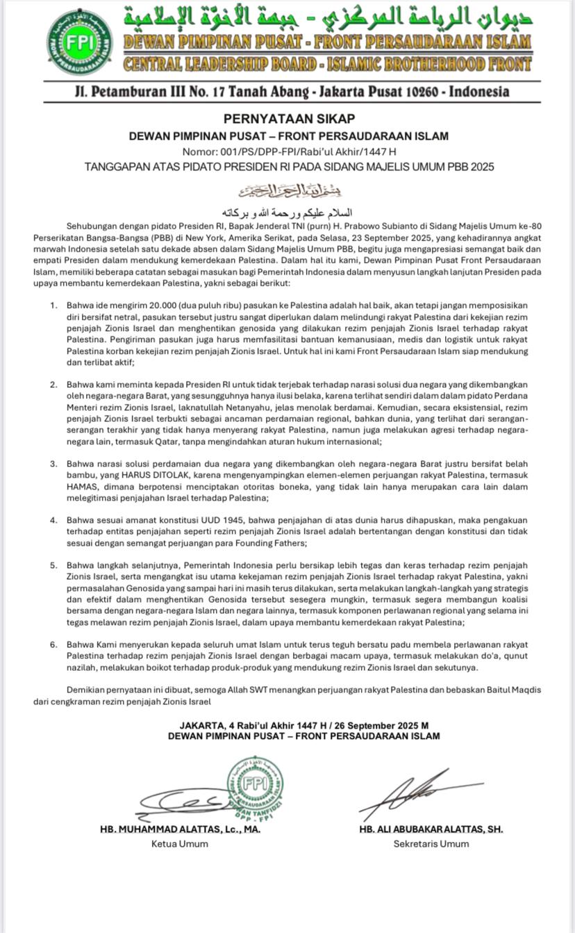 LensaRadar, Dewan Pimpinan Pusat Front Persaudaraan Islam (DPP FPI) mengeluarkan pernyataan sikap resmi terkait pidato Presiden RI, Jenderal TNI (Purn...